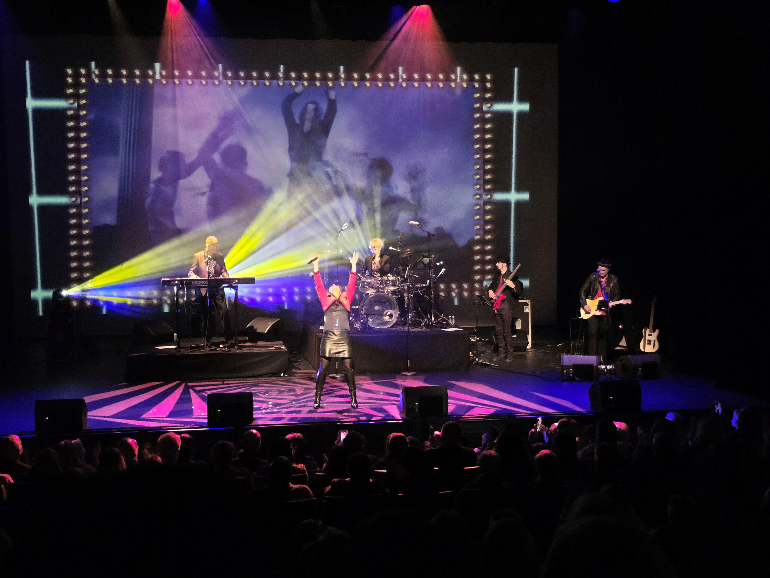 Brian Mannix, Ally Fowler, Wilbur Wilde and Scott Carne with their arms in the air at the end of a song that they are singing together. The band is in the background featuring a keyboard player, drummer, bass guitarist and guitarist.The crowd in front of them is cheering.
