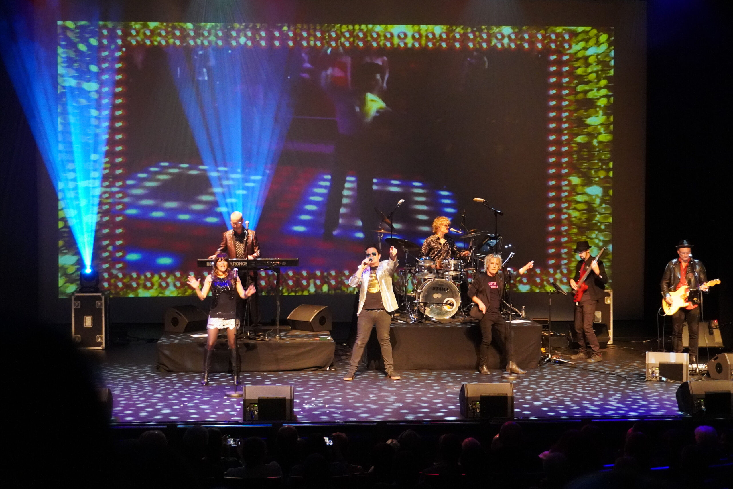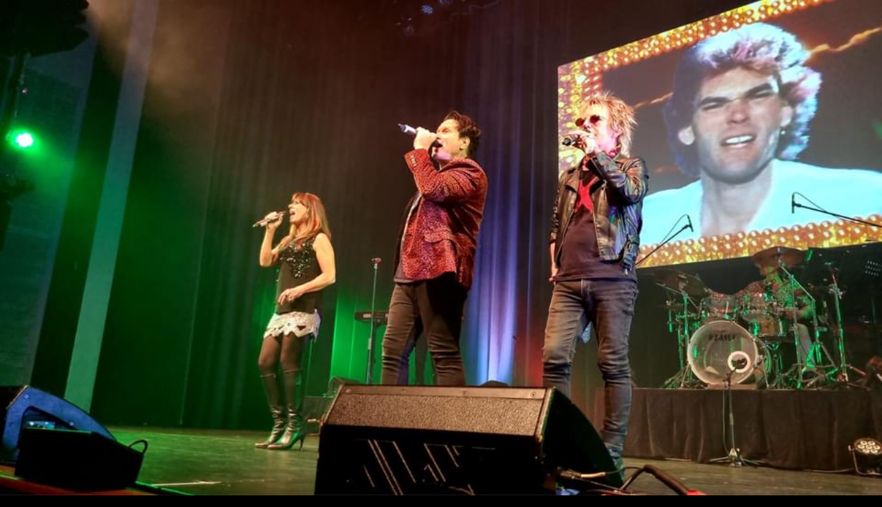 Scott Carne, Ally Fowler and Brian Mannix singing on stage with a band behind them and blue lights shining up.