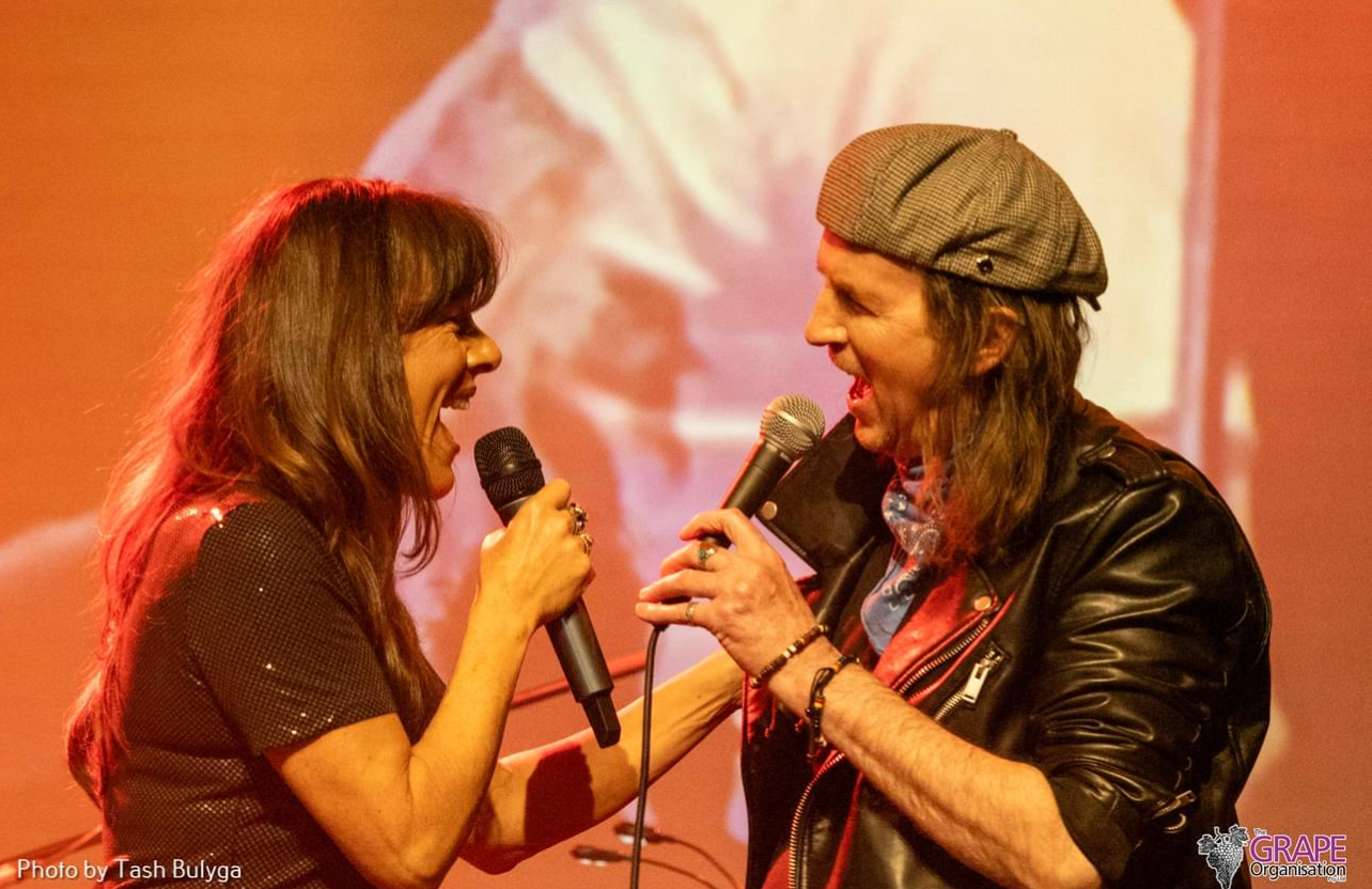 Scott Carne and Ally Fowler singing a duet together on stage with a band behind them.