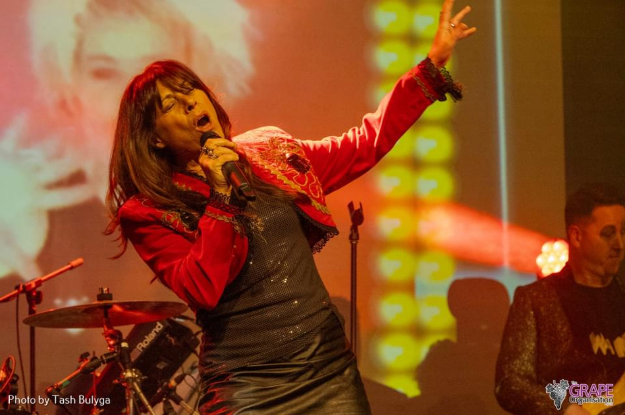 Ally Fowler wearing a red bolero over a black top and black leather skirt as she sings into a microphone.