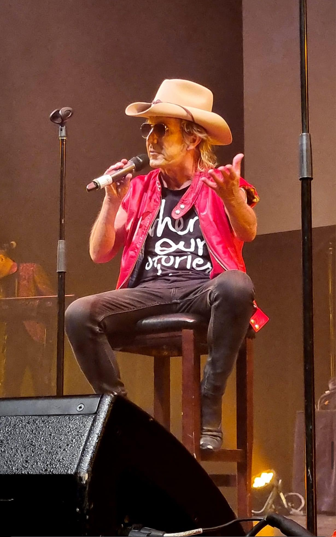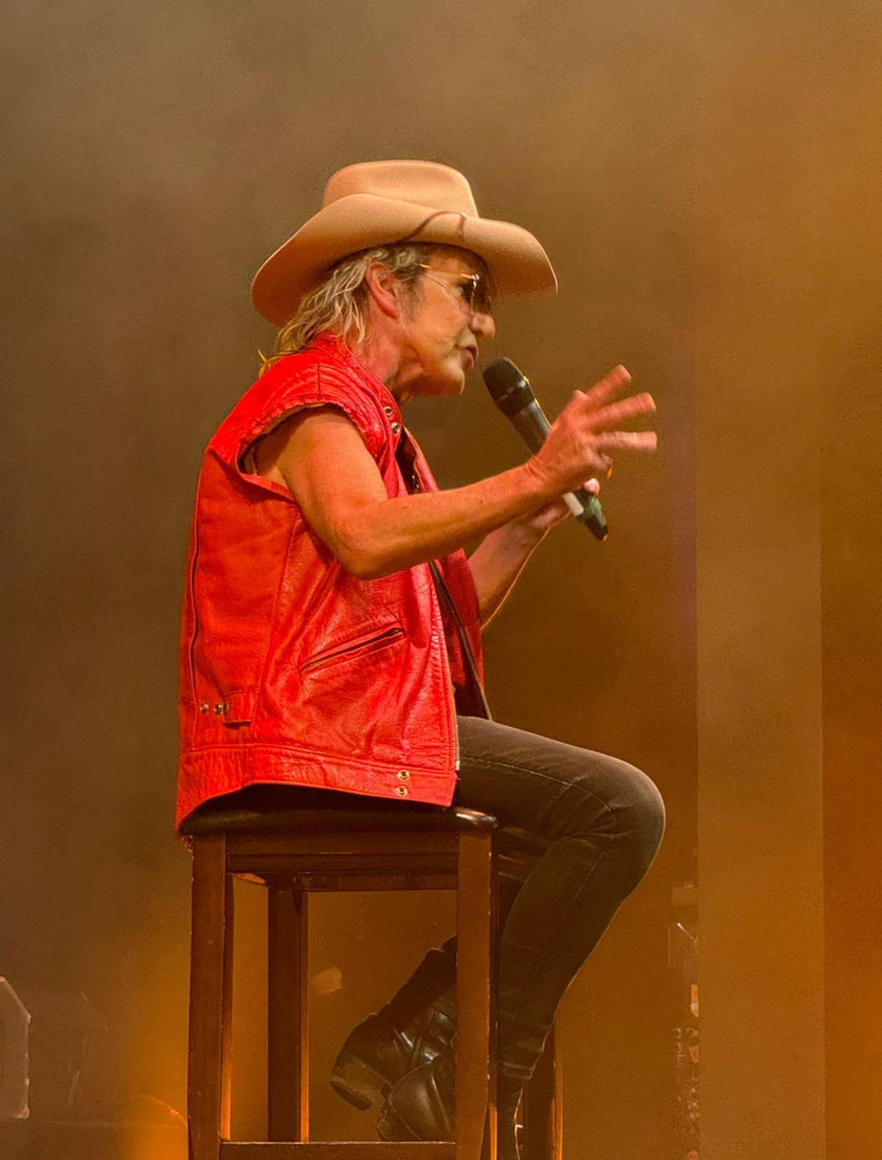 Brian Mannix sitting on a chair pretending to be Molly Meldrum while weating a red vest and Akubra hat.