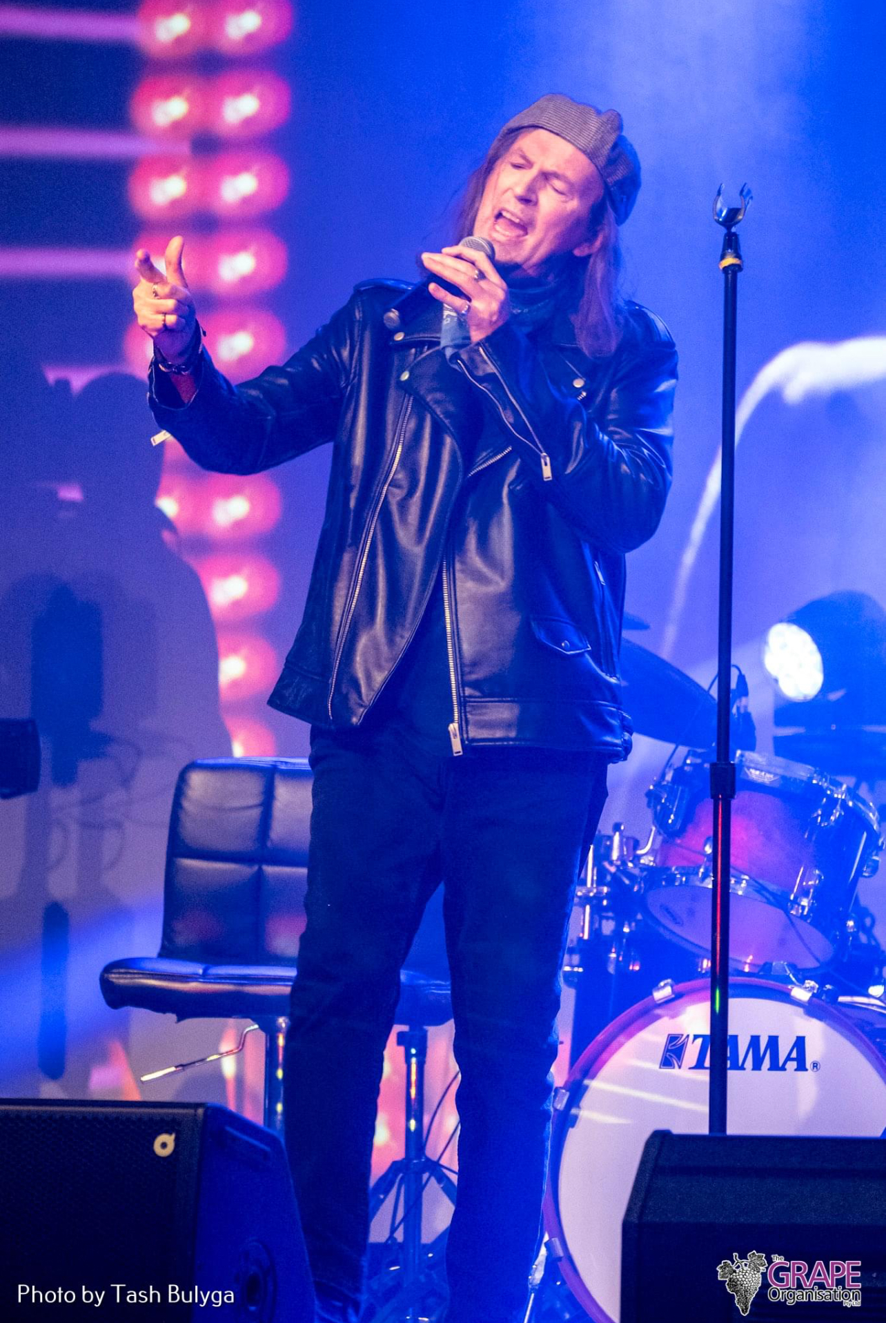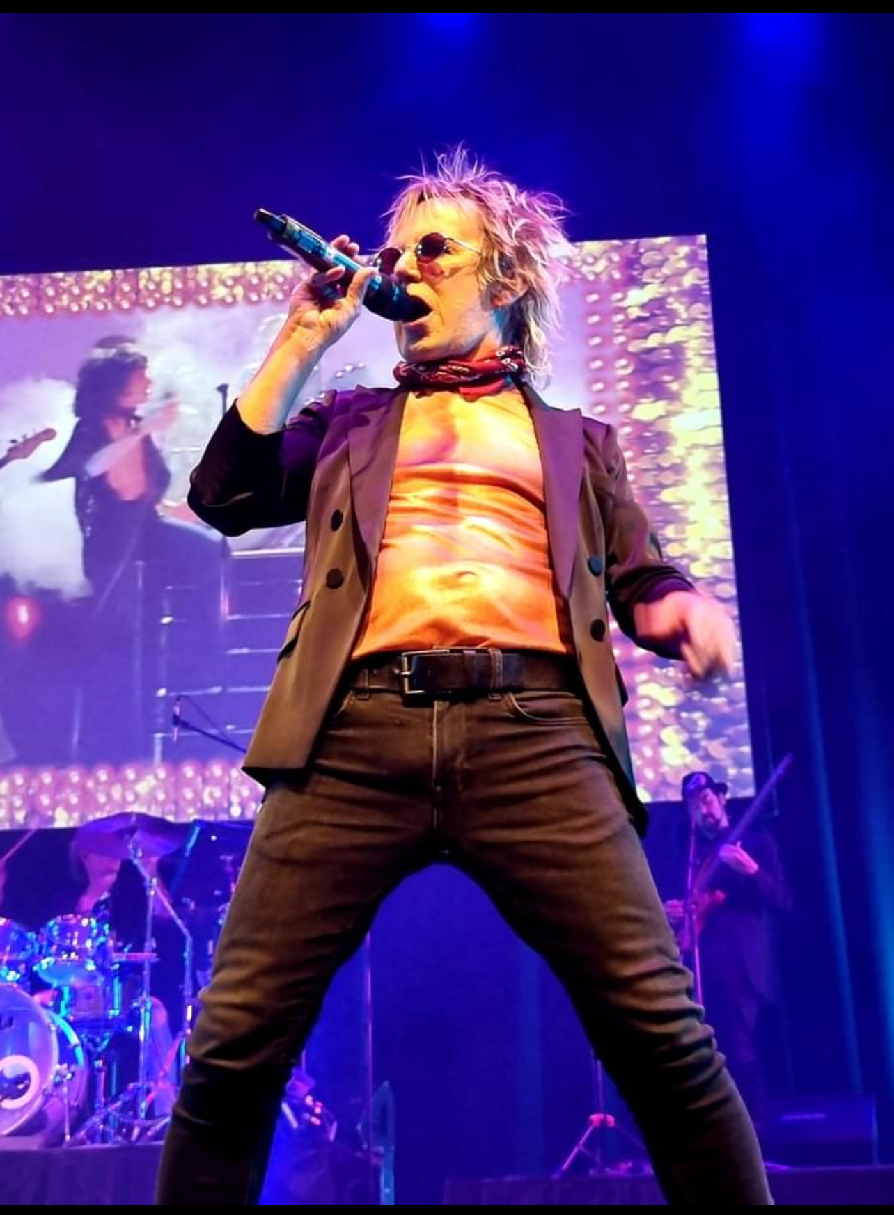Scott Carne on stage surrounded by blue glowing lights. He's wearing a Little Richard shirt, red jacket and black jeans. He's holding a microphone with one arm in the air while singing.