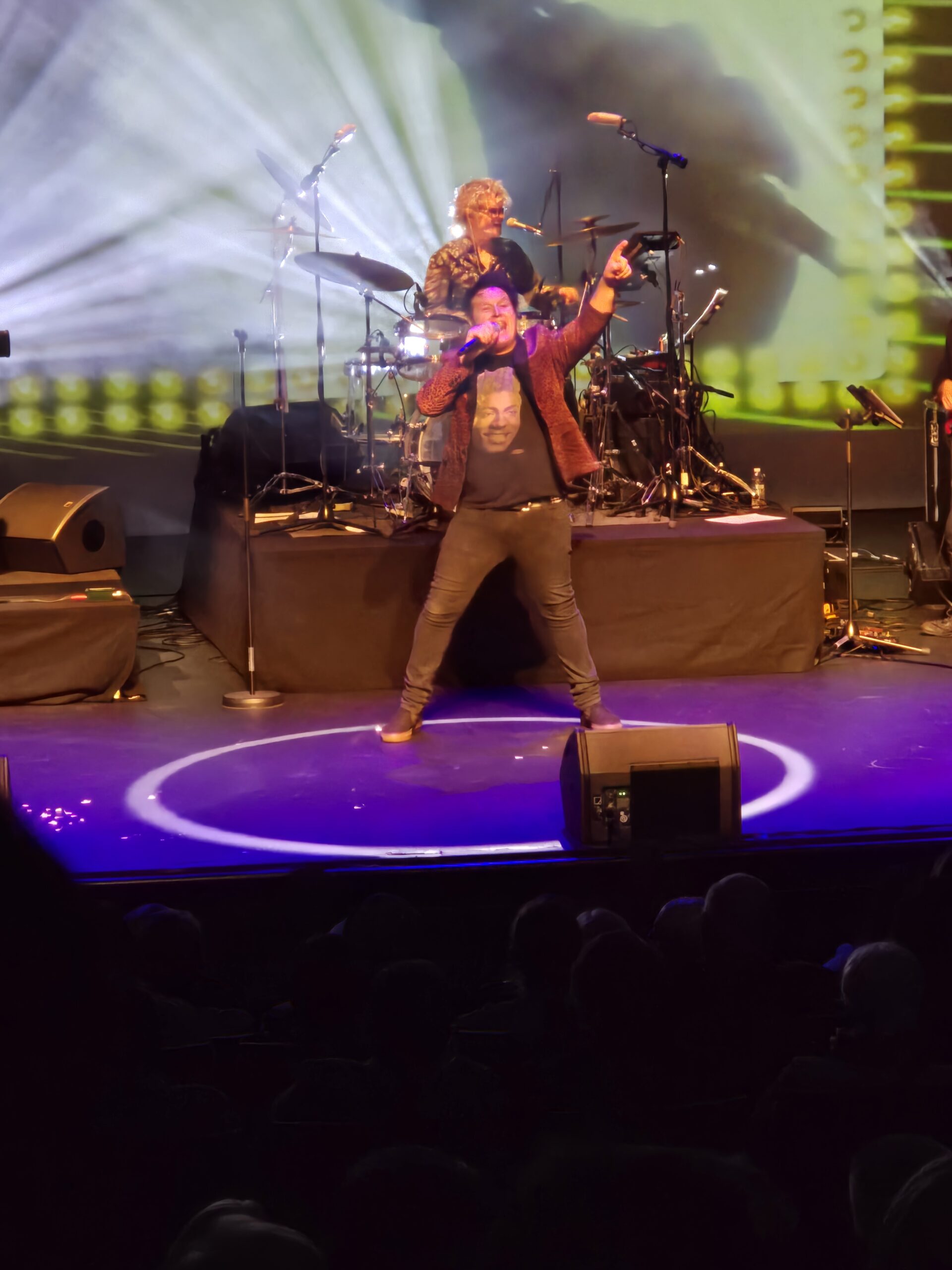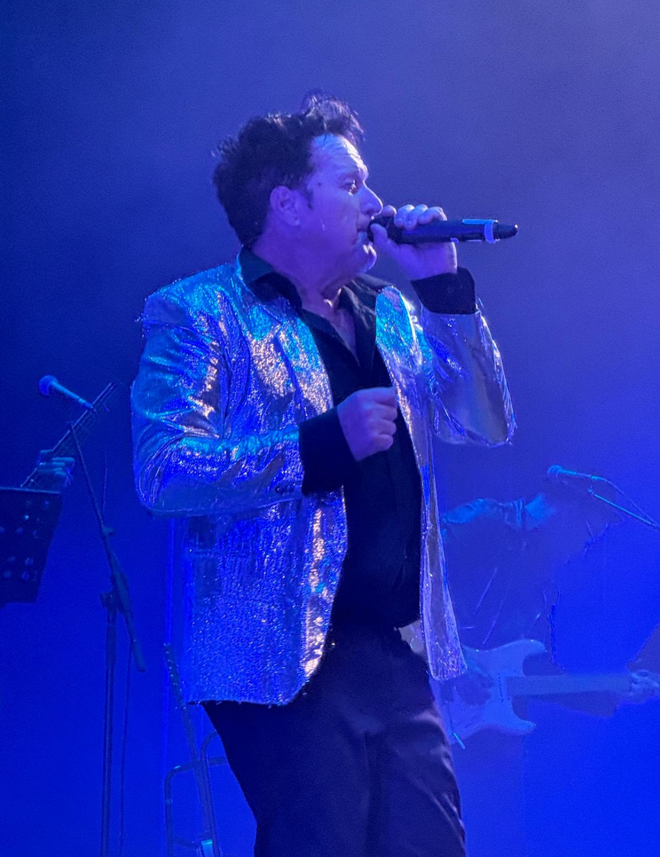 Sean Kelly holding a microphone singing on stage with blue lighting.