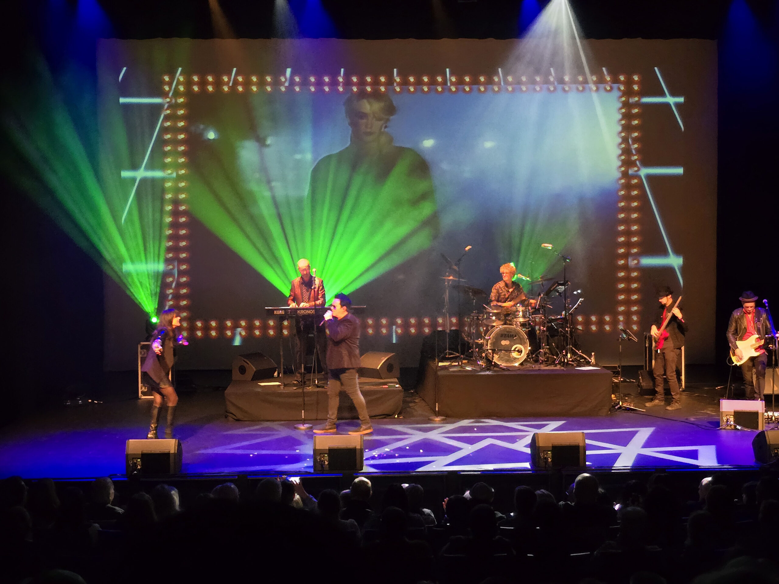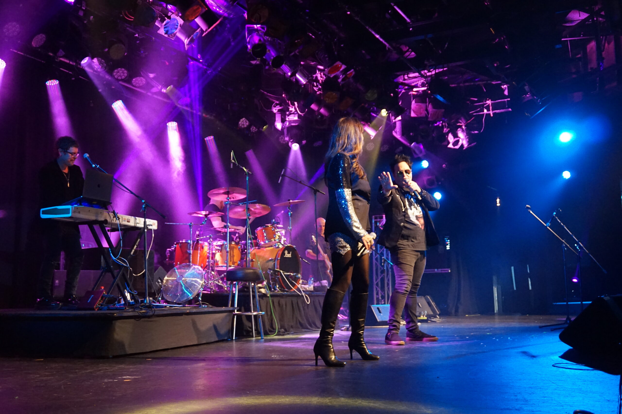 Scott Carne and Ally Fowler singing together on stage with a band behind them and green neon lighting.