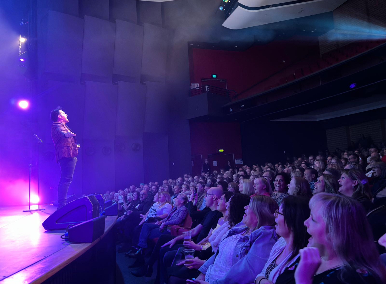Scott Carne singing on stage looking out at a large, happy audience seated in a theatre.