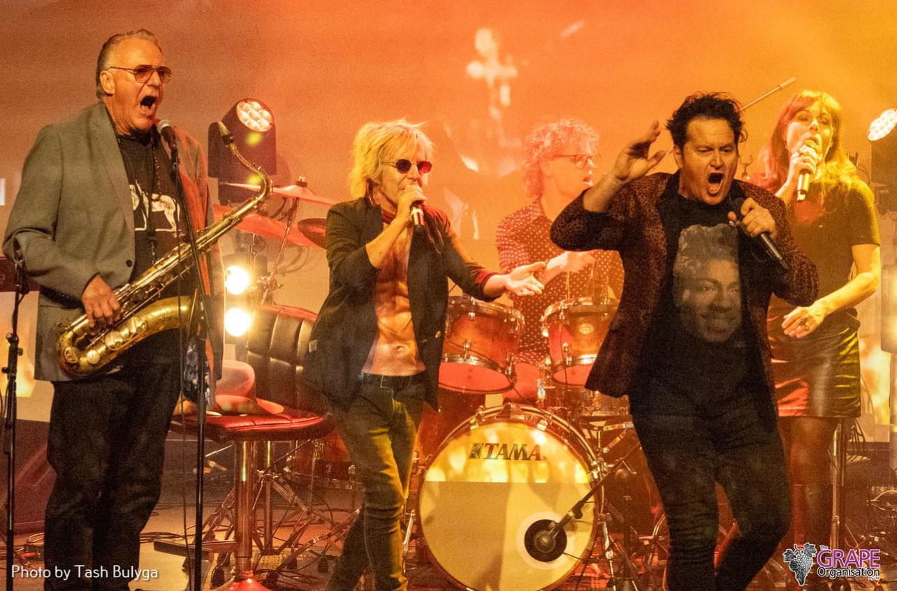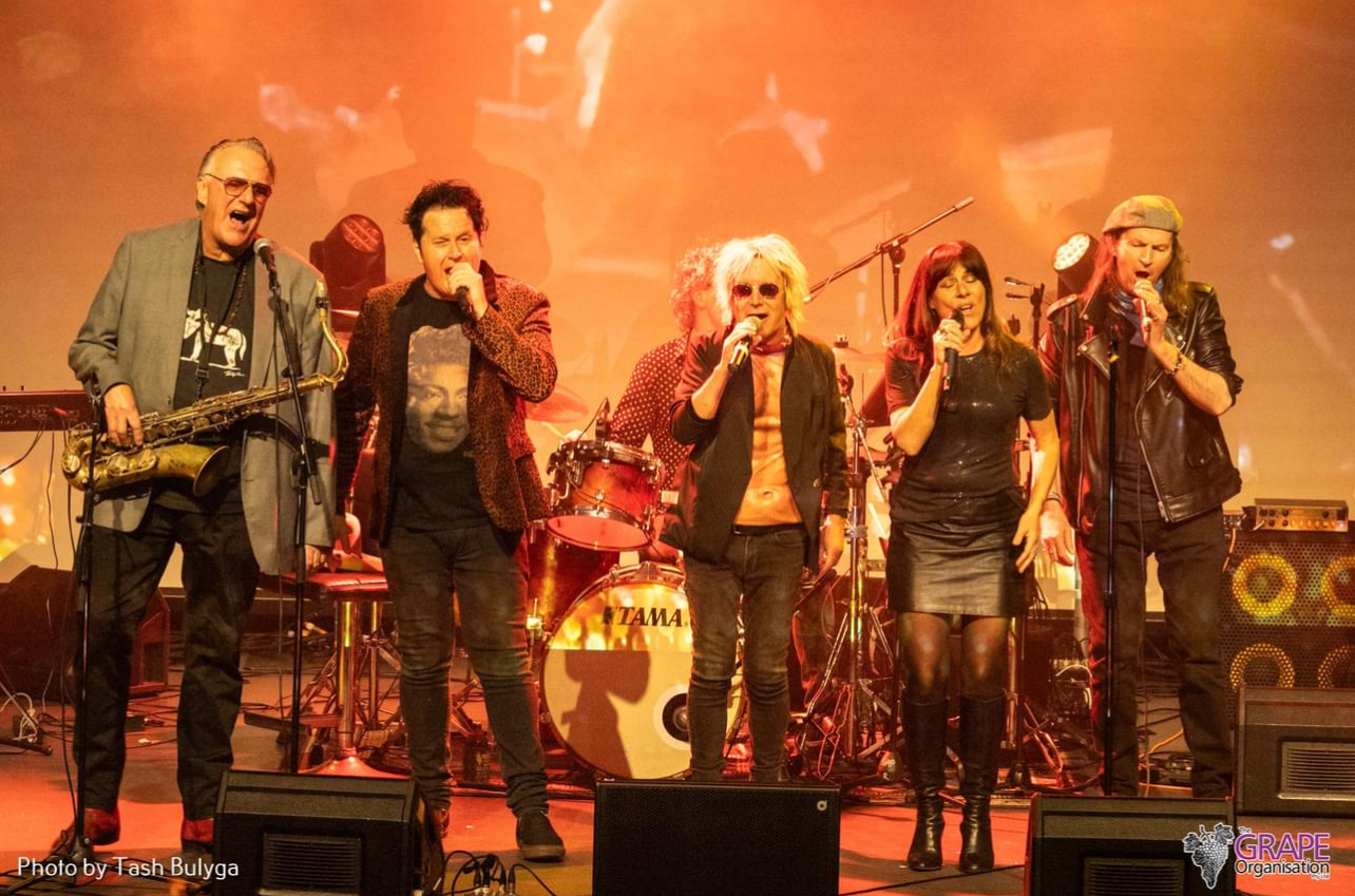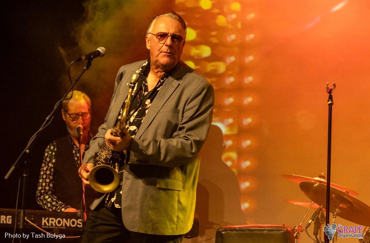 Wilbur Wilde on stage holding a saxophone next to Brian Mannix, Scott Carne and Ally Fowler who are all dinging. A drummer is playing behind them.
