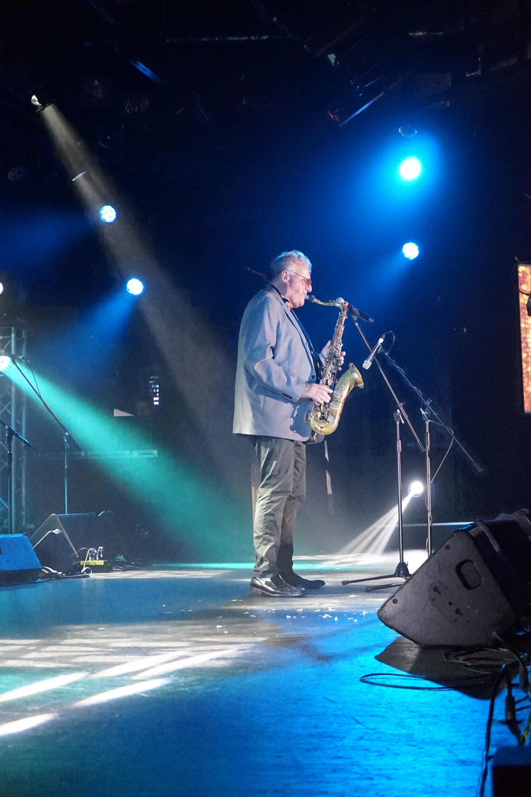 Wilbur Wilde standing on stage under blue lights playing his saxophone.